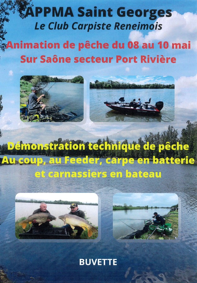 Du 8 au 10 mai, la Saône s’anime ! L’AAPPMA de Saint-Georges et le Club Carpiste Reneimois s’associent pour vous proposer trois jours d’immersion dans l’univers de la pêche. Que vous soyez amateur ou pêcheur confirmé, venez découvrir la diversité des techniques lors de démonstrations commentées.