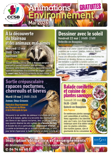La Communauté de Communes Saône-Beaujolais (CCSB) vous propose un superbe programme d’animations environnementales en mai, et c’est totalement GRATUIT ! 🎁